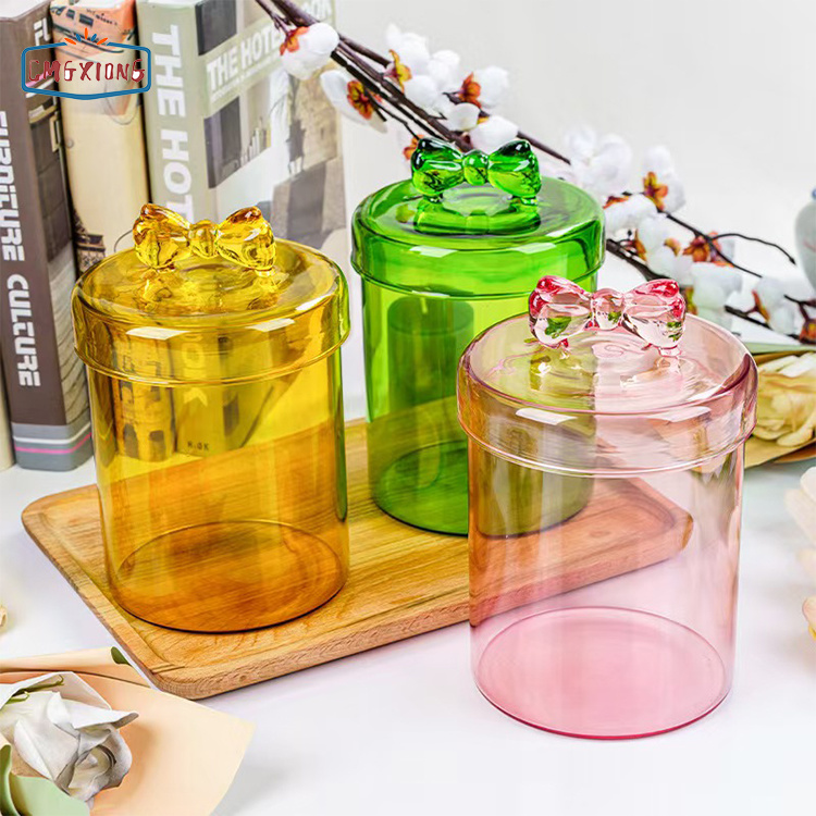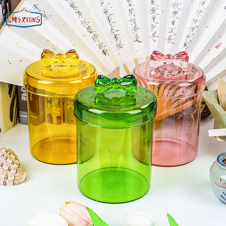 Modern bow-tie design glass storage jar, seven-color transparent desktop container—dustproof and moisture-proof for kitchen food storage and seasoning.
