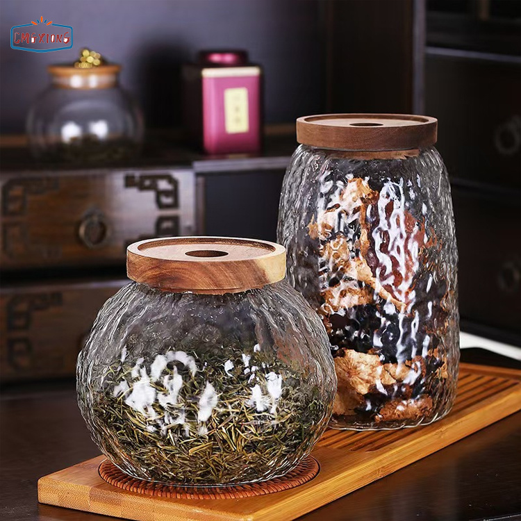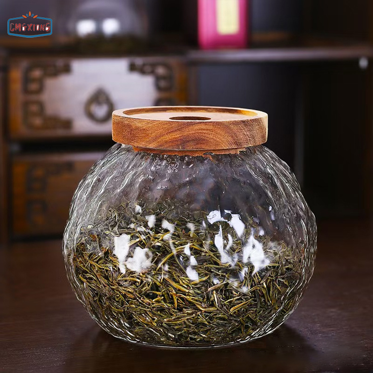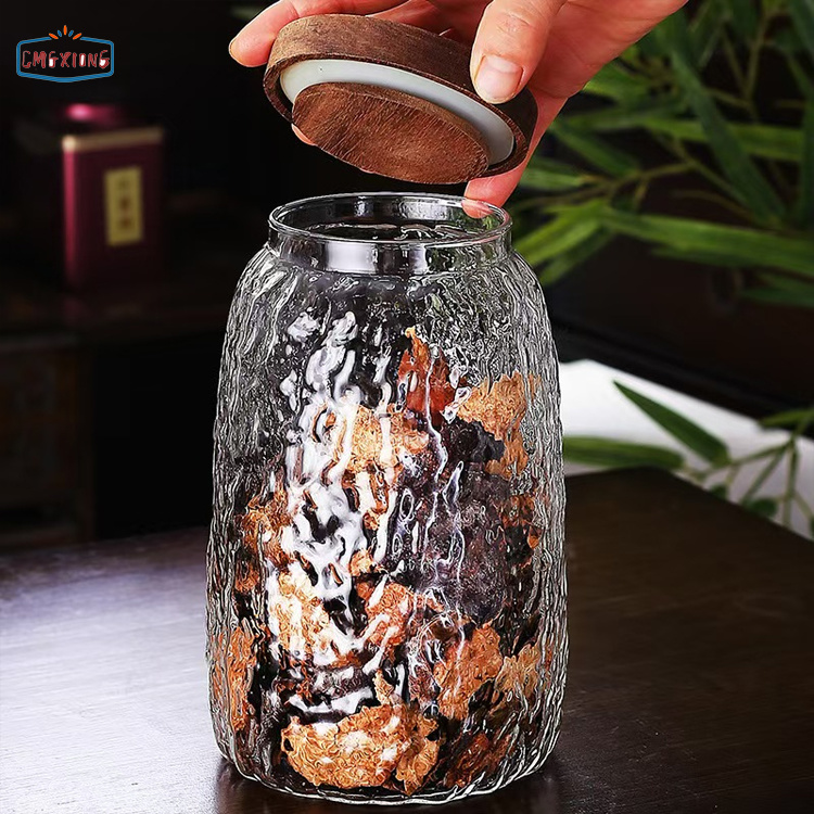 Luxury crystal glass airtight wide-mouth storage jar with abrasive surface, featuring a round wooden lid